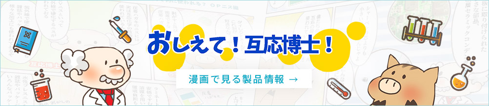 PRODUCT 製品情報 スペシャリティー・ケミカルズ企業の道を歩む「独自技術の互応」 互応化学の製品について→ 01 エレクトロニクス用途 02 ライフマテリアル用途 03 特殊工業用途 資材部→ 互応化学の品質・環境について→
